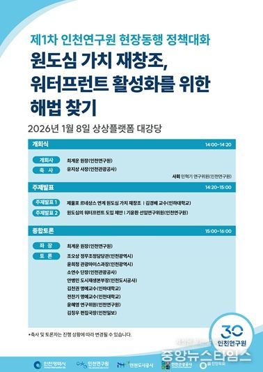 주제발표는 ▲인천학회 김경배 회장이 “제물포 르네상스 연계 원도심 가치 재창조”, ▲인천연구원 기윤환 선임연구위원이 “원도심의 워터프런트 도입 제안”을 주제로 진행한다.