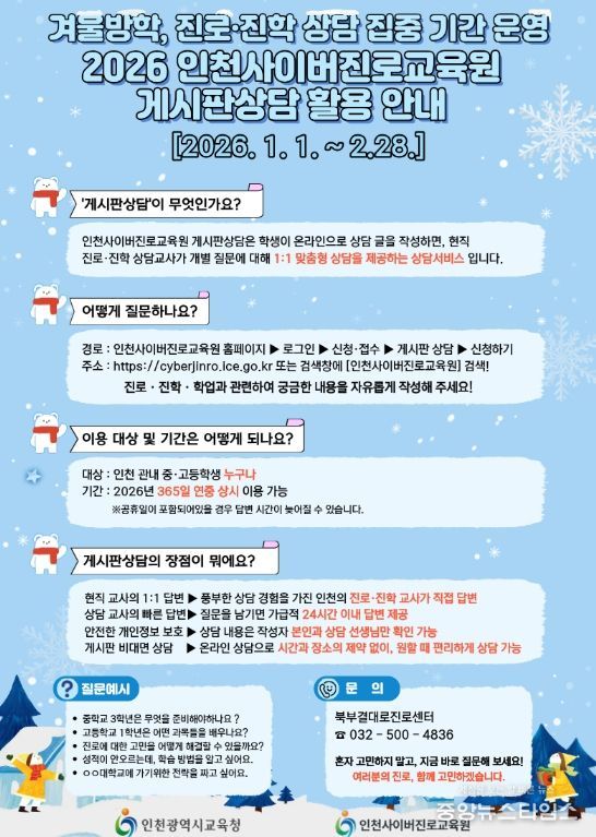 인천시교육청 관계자는 “인천사이버진로교육원 게시판 상담은 학생들이 혼자 고민하기 쉬운 진로·진학 문제를 현직 교사와 함께 해결할 수 있는 지원 창구”라며 “겨울방학 동안 학생들이 자신의 진로를 탐색하고, 새 학년을 준비하는 데 도움이 되길 기대한다”고 말했다.