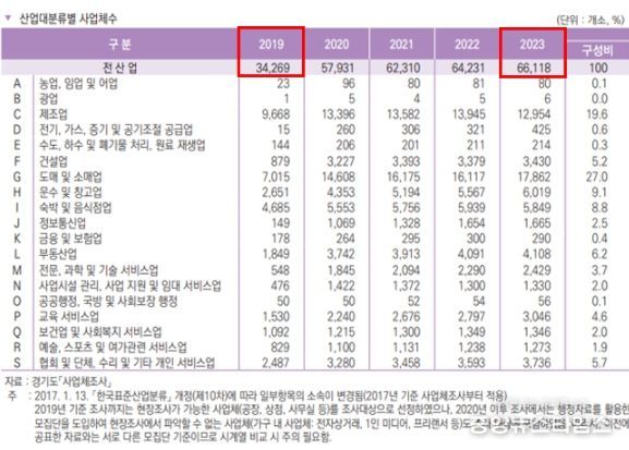 먼저, ▲기업체 분야를 살펴보면 2023년 기준 김포시 전체 사업체 수는 66,118개소로, 2019년 대비 31,849개소(92.9%↑)가 증가했다. 특히 에너지 산업(전기·가스 등) 분야의 성장세가 뚜렷했으며, 300~499명 규모의 중대형 사업체도 250% 늘어 지역 경제의 자족 기능이 강화되고 있는 것으로 분석된다.