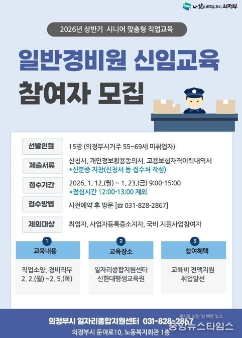 (중앙뉴스타임스 = 방재영 기자) 의정부시는 관내 시니어 세대의 재취업을 지원하고 안정적인 일자리를 연계하기 위해 ‘일반경비원 신임교육’ 참여자를 모집한다.