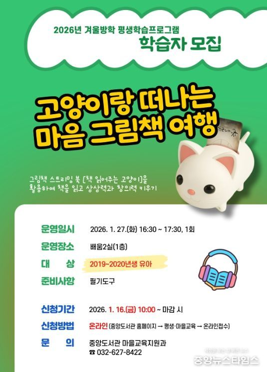 수강료는 무료이며 1월 27일에 운영되며, 참여 신청은 1월 16일 10시부터 중앙도서관 누리집에서 선착순으로 진행된다.