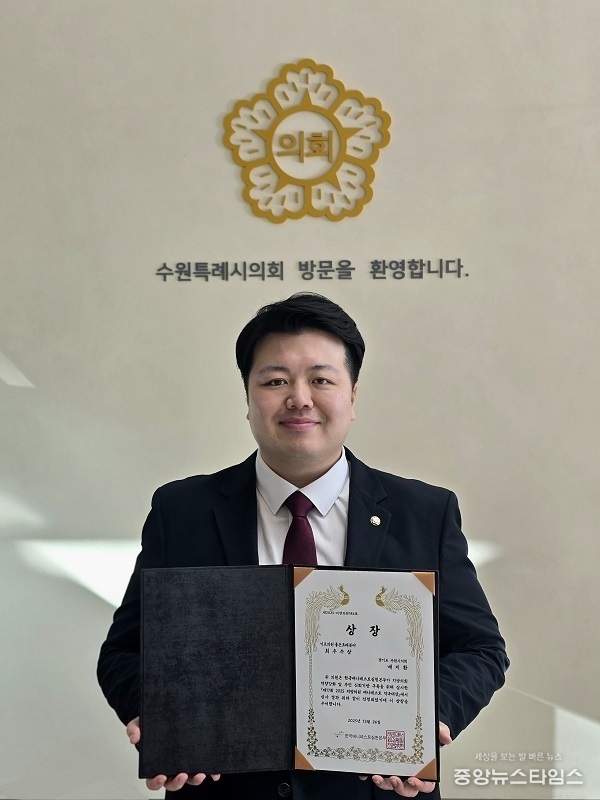 (중앙뉴스타임스 = 방재영 기자) 수원특례시의회 배지환 의원(국민의힘, 매탄1·2·3·4동)이 한국매니페스토실천본부가 주관하는 ‘제17회 2025 지방의원 매니페스토 약속대상’에서 ‘좋은조례 분야 최우수상’을 수상했다고 13일 밝혔다.