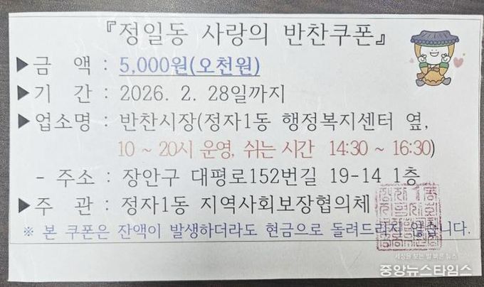 (중앙뉴스타임스 = 방재영 기자) 수원시 장안구 정자1동 지역사회보장협의체는 금년부터 관내 취약계층 가구를 대상으로 매월 5가구에 2만원 상당의 반찬쿠폰을 지급하는 사업을 시작한다고 지난 13일 밝혔다.