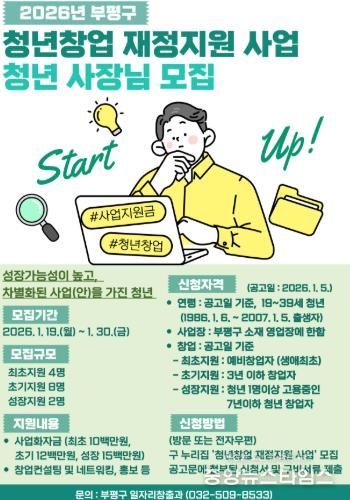 (중앙뉴스타임스 = 방재영 기자) 부평구가 19일부터 30일까지 지역 청년들의 창업 활성화를 위해 ‘2026년 청년창업 재정지원 사업’의 참여자를 모집한다.