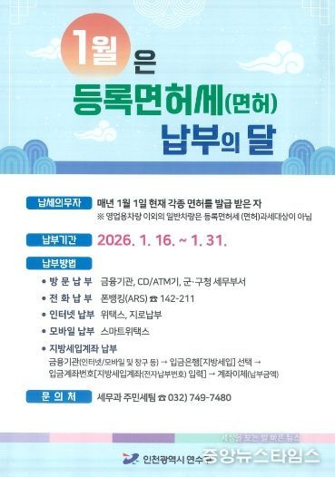 (중앙뉴스타임스 = 방재영 기자) 인천 연수구는 2026년 정기분 등록면허세(면허)로 4만 9천여 건에 17억 원을 부과했다.