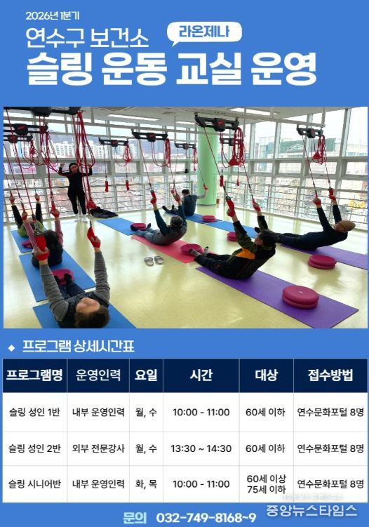 (중앙뉴스타임스 = 방재영 기자) 인천 연수구 보건소는 오는 19일부터 23일까지 2026년 1기 ‘슬링 운동프로그램’ 참여자를 모집한다고 16일 밝혔다.
