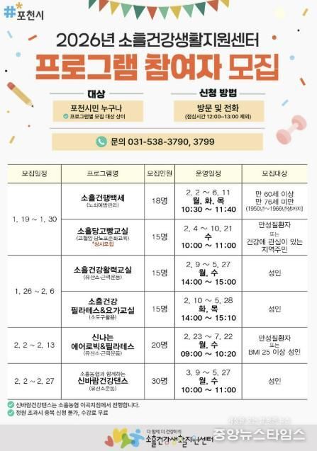 (중앙뉴스타임스 = 방재영 기자) 포천시 소흘건강생활지원센터는 시민들의 건강 증진과 활기찬 일상 지원을 위해 오는 19일부터 ‘2026년 상반기 건강증진 프로그램’ 참여자를 모집한다고 16일 밝혔다.