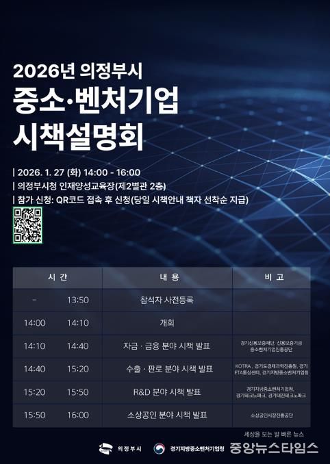 (중앙뉴스타임스 = 방재영 기자) 의정부시는 1월 27일 시청 인재양성교육장에서 ‘2026년 중소‧벤처기업 시책설명회’를 개최한다.