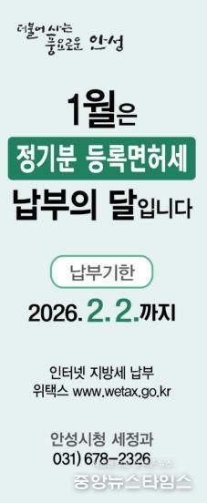 (중앙뉴스타임스 = 방재영 기자) 안성시는 2026년도 정기분 등록면허세(면허분) 4만 2,100건에 대해 총 5억 5천만 원을 부과했다고 밝혔다.