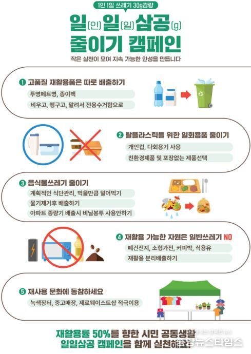 (중앙뉴스타임스 = 방재영 기자) 안성시는 시민의 자발적인 실천을 통해 재활용률을 높이고 생활쓰레기 발생량을 줄이기 위한 ‘1인 1일 쓰레기 30그램 줄이기(일일삼공) 캠페인’을 적극 추진하고 있다고 밝혔다.