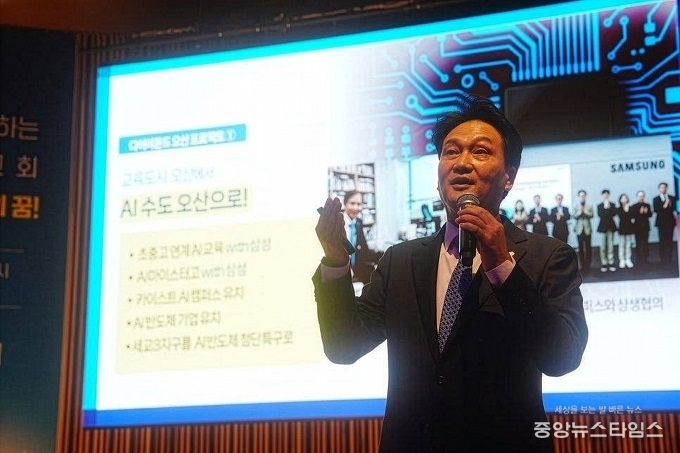 또한 “2019년부터 AI를 본격적으로 공부하며 서울대 장병탁 교수의 AI 연구실을 방문했고, 삼성 멀티캠퍼스, 경기 남부 반도체 공장과 소부장 업체, 성남 지역 팹리스 기업 등을 방문해 산업 현장의 목소리를 들어왔다”고 전했다. 이에 대해 “이러한 과정 끝에 오산 세교AI특성화고등학교 유치에 성공했으며, 해당 학교는 올해 3월 개교를 앞두고 있다”고 설명했다.