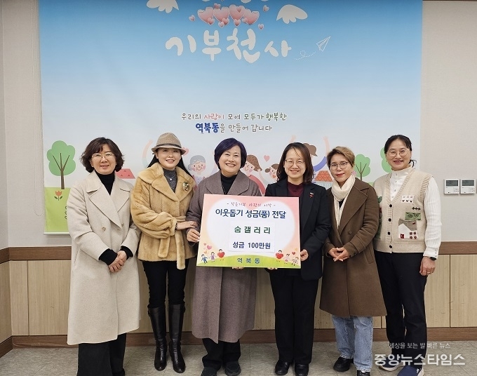 역북동은 13일 숨갤러리가 지난해 12월 16일부터 31일까지 진행한 ‘크리스마스 선물전’의 전시 수익금 100만 원을 기탁했다고 밝혔다.