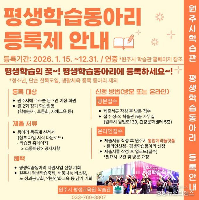 (중앙뉴스타임스 = 방재영 기자) 원주시 평생교육원 학습관은 관내에서 활동하고 있는 잠재적 평생학습동아리를 발굴하기 위해 ‘평생학습동아리 등록제’를 운영하고 있다.