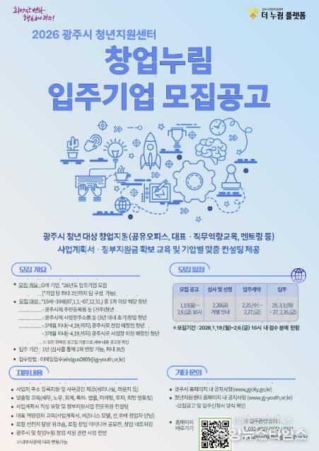 (중앙뉴스타임스 = 방재영 기자) 광주시는 지역 내 유망한 청년 창업가를 발굴하고 안정적인 창업 환경을 조성하기 위해 ‘2026년도 창업누림 신규 입주기업’을 공개 모집한다고 19일 밝혔다.