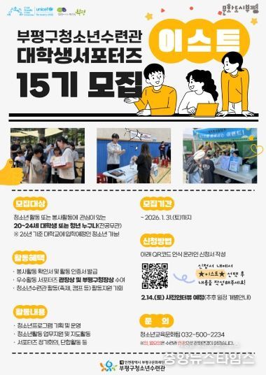 (중앙뉴스타임스 = 방재영 기자) 인천 부평구 청소년수련관이 오는 31일까지 지역 내 청소년들을 위해 활동할 대학생 서포터즈 ‘이스트’ 10기 신규단원을 모집한다고 19일 밝혔다.
