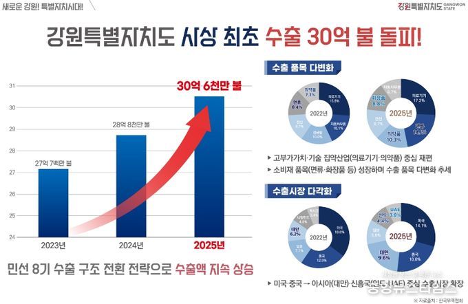 (중앙뉴스타임스 = 방재영 기자) 강원특별자치도는 민선 8기 출범 이후 미국의 관세 부과와 신보호무역주의 확산, 국제 분쟁 장기화 등 어려운 통상 여건 속에서도 사상 처음으로 연간 수출 30억 불(한화 4조 5천억 원)을 달성했다고 밝혔다.