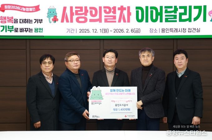 (중앙뉴스타임스 = 방재영 기자) 용인도시공사는 19일 ‘노사합동 사랑의열차 이어달리기’ 성금 1,400만원을 용인특례시에 기탁했다.