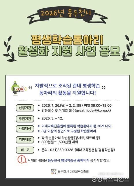 (중앙뉴스타임스 = 방재영 기자) 동두천시는 오는 1월 26일부터 2월 2일까지, 시민 주도형 평생학습 문화 확산을 위해 ‘2026년 평생학습 동아리 활성화 지원사업’에 참여할 학습동아리를 모집한다고 밝혔다.