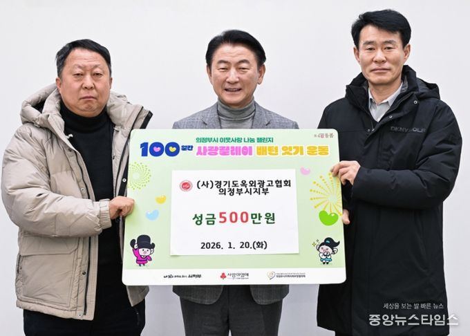 (중앙뉴스타임스 = 방재영 기자) 의정부시는 1월 20일 (사)경기도옥외광고협회 의정부시지부가 ‘100일간 사랑릴레이 배턴 잇기’에 동참해 성금 500만 원을 기탁했다고 밝혔다.
