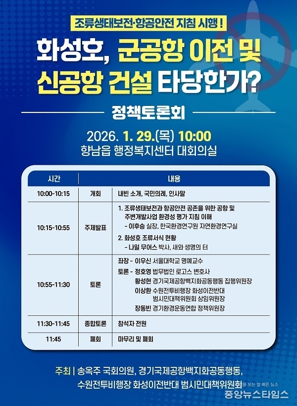 한편, ‘‘조류생태보전·항공안전 지침 시행!’ 화성호, 군공항 이전 및 신공항 건설 타당한가‘ 정책토론회는 오는 29일 오전 10시 화성시 향남읍 행정복지센터 대회의실에서 열린다.