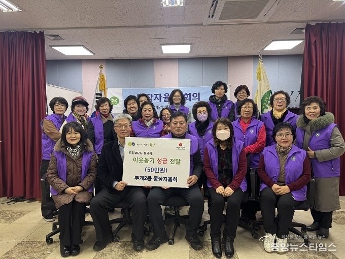 (중앙뉴스타임스 = 방재영 기자) 인천 부평구 부개2동은 23일 설 명절을 맞아 통장자율회로부터 ‘설맞이 이웃사랑 나눔’을 위한 성금 50만원을 전달받았다.