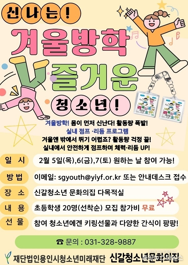 신갈청소년문화의집 관계자는 “겨울방학 동안 아이들이 스마트폰이나 실내 활동에만 머무르지 않고, 즐겁게 몸을 움직이며 건강한 에너지를 발산할 수 있도록 프로그램을 준비했다”며 “놀이처럼 즐기다 보면 자연스럽게 체력과 자신감이 자라는 시간이 될 것”이라고 전했다.