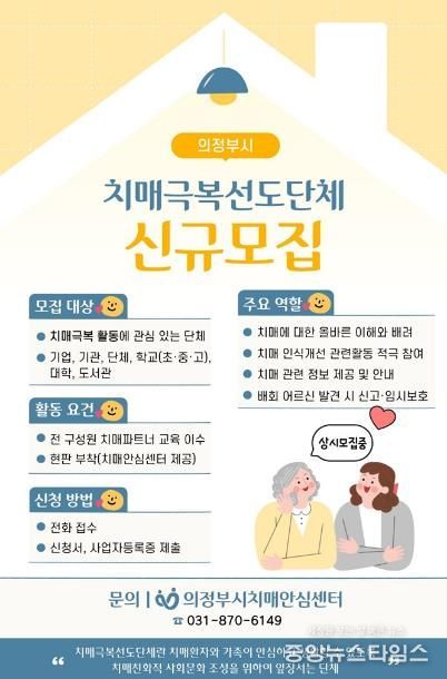 (중앙뉴스타임스 = 방재영 기자) 의정부시 보건소 치매안심센터는 치매에 대한 이해와 공감을 바탕으로 치매 친화적 환경을 조성하기 위해 ‘치매극복선도단체’를 연중 모집한다.