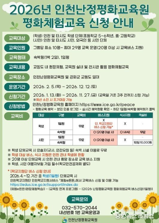(중앙뉴스타임스 = 방재영 기자) 인천광역시교육청난정평화교육원은 2월 5일부터 12월 12일까지 학생과 시민을 대상으로 ‘2026년 평화체험교육’을 운영한다.