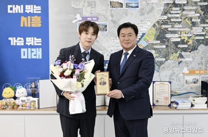 (중앙뉴스타임스 = 방재영 기자) 시흥시는 인기 경연 프로그램 ‘미스터트롯2’ 출신 가수 진욱을 시흥시 명예문화홍보대사로 위촉하고, 28일 시장실에서 위촉장을 전달했다.