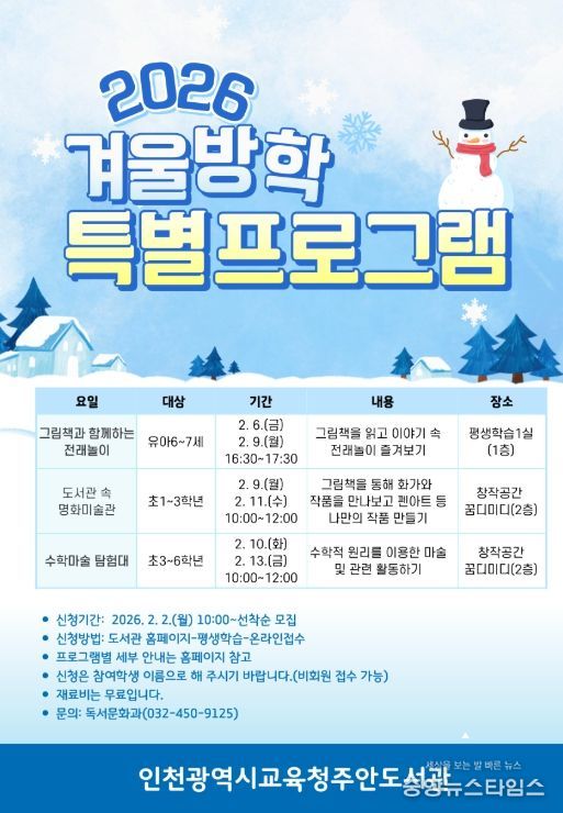 (중앙뉴스타임스 = 방재영 기자) 인천광역시교육청주안도서관은 관내 유·초등학생에게 다양한 평생학습 기회를 제공하기 위해 2월 6일부터 13일까지 ‘겨울방학 특별프로그램’을 운영한다.