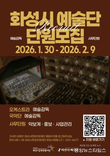 (중앙뉴스타임스 = 방재영 기자) (재)화성시문화관광재단은 2026년 ‘화성시 예술단’을 이끌어갈 예술감독과 사무단원을 모집한다.
