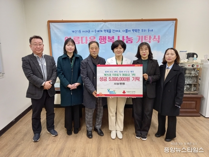 (중앙뉴스타임스 = 방재영 기자) 인천 계양구에 위치한 서송병원(대표원장 김홍용)은 1월 27일 지역 내 어려운 이웃들을 위해 써달라며 이웃돕기 성금 500만 원을 계산1동 행정복지센터(동장 김희수)에 기탁했다.
