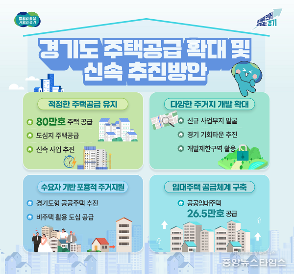 첫째, 2030년까지 주택 80만 가구를 차질 없이 공급해 도민의 주거 불안을 근본적으로 해소하기 위해 공공에서 17만 가구를 민간에서 63만 가구를 공급하며, 공급유형별로는 아파트 62만 가구, 다세대·단독주택 등은 18만 가구를 공급하고, 도민들이 선호하는 입지에 양질의 주택을 적기에 공급하기 위해 1기 신도시 재정비와 노후 원도심 활성화와 도심지 노후 공공청사 복합개발추진이다.