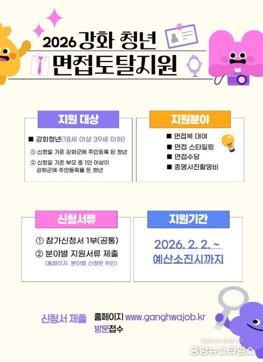 (중앙뉴스타임스 = 방재영 기자) 강화군 창업‧일자리센터가 오는 2일부터 '강화 청년 면접 지원-면접 토탈 솔루션'을 시작한다.