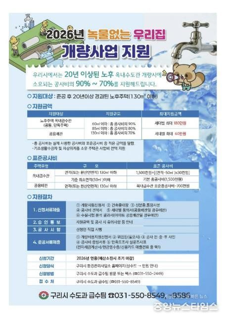 (중앙뉴스타임스 = 방재영 기자) 구리시는 2026년 수도관 개량 공사비 지원 사업의 신청을 2일부터 접수한다고 밝혔다.