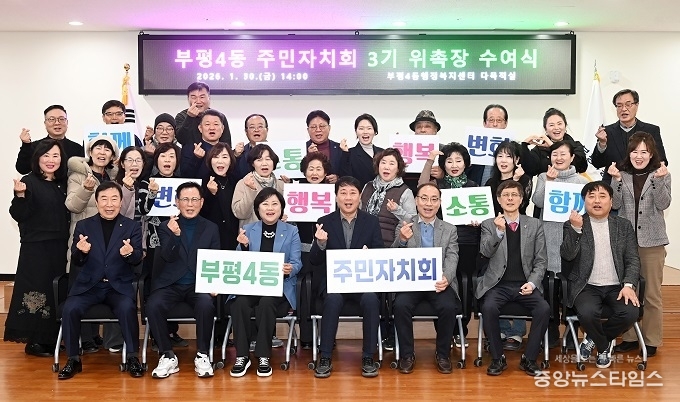 (중앙뉴스타임스 = 방재영 기자) 인천 부평구 부평4동 주민자치회는 지난 30일 동 행정복지센터에서 제3기 주민자치회 위원 위촉장 수여식을 개최했다.