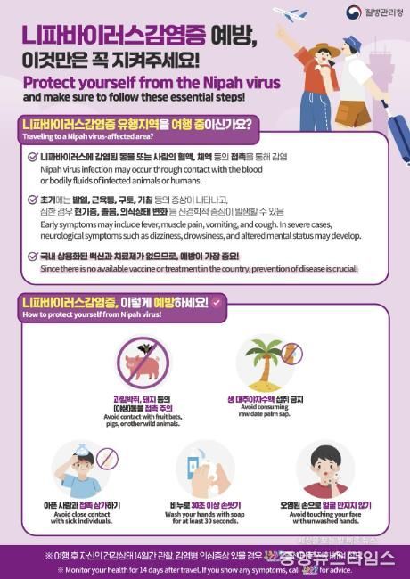 니파바이러스는 동물(과일박쥐ㆍ돼지 등)과 접촉하거나 오염된 식품(대추야자 수액 등)을 섭취하면 감염될 수 있으며, 환자의 체액과 밀접 접촉 시 사람 간 전파도 가능하다. 감염 초기에는 발열, 두통, 근육통이 나타나며 현기증, 졸음, 의식 저하 등 신경계 증상 및 중증으로 악화해 사망에 이를 수 있어 주의가 필요하다.
