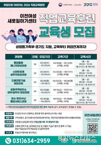 (중앙뉴스타임스 = 방재영 기자) 이천여성새로일하기센터는 경력 단절 여성의 직업능력 개발과 취·창업 연계를 위해 2026년 직업교육훈련 교육생을 모집한다.