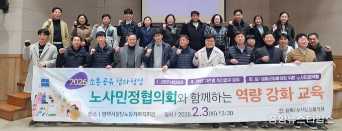 (중앙뉴스타임스 = 방재영 기자) 평택시노사민정협의회는 지난 3일 분과위원회 및 실무협의회 위원을 대상으로 '2026년 노사민정협의회 통합회의 및 일·생활 균형을 위한 역량 강화 교육'을 평택시 장당노동자복지회관 대회의실에서 개최했다.