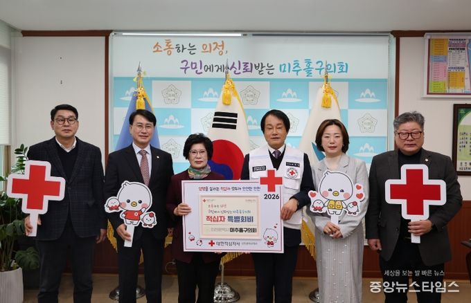 (중앙뉴스타임스 = 방재영 기자) 인천 미추홀구의회는 4일 의회 의장실에서 전경애 의장과 장규철 부의장을 비롯한 상임위원장들과 조의영 대한적십자사 인천지사 회장 및 조혜정 적십자봉사회 미추홀지구협의회 회장과 관계 임원들이 참석한 가운데 2026년도 적십자 특별회비 전달식을 개최했다.