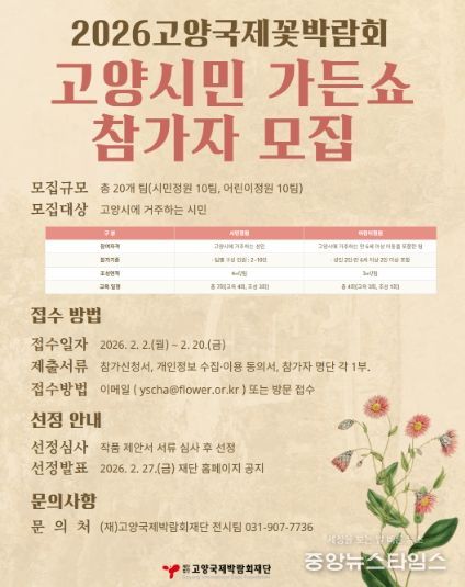 (중앙뉴스타임스 = 이광운 기자) (재)고양국제박람회재단이 오는 4월 24일 일산호수공원에서 개최되는 2026고양국제꽃박람회의 시민 참여 프로그램 ‘고양시민 가든쇼’의 참가자를 이달 20일까지 모집한다.