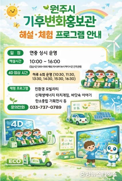 (중앙뉴스타임스 = 방재영 기자) 원주기후변화홍보관은 남녀노소 누구나 연중 상시 무료로 이용할 수 있는 시설로, 기후변화와 탄소중립에 대한 다양한 전시 해설과 체험 프로그램을 운영하고 있다.