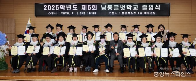 행사는 졸업장 수여와 모범상, 개근상 시상, 구청장 축사, 송사, 답사, 기념 촬영 순으로 진행됐으며, 시화 작품과 학습 결과물을 전시해 그동안의 배움의 여정을 한눈에 볼 수 있는 자리도 마련됐다.