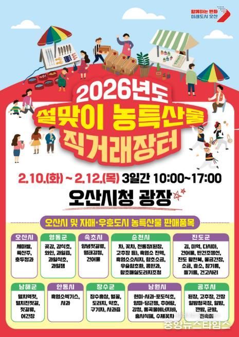 (중앙뉴스타임스 = 방재영 기자) 오산시는 설 명절을 맞아 오는 2월 10일부터 12일까지 3일간, 오전 10시부터 오후 5시까지 오산시청 광장에서 자매·우호도시와 함께하는 ‘설맞이 농특산물 직거래장터’를 개최한다고 밝혔다.