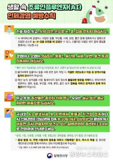인체감염 예방을 위해서는 ▲손을 자주 씻고, 씻지 않은 손으로 눈·코·입을 만지지 않기 ▲감염 또는 오염이 의심되는 동물과 부산물, 사체, 분변, 오염된 물건과 접촉하지 않기 ▲닭고기 등 축산물은 충분히 익혀 섭취하고 우유는 살균·멸균 처리된 제품을 마시기 등 기본적인 예방수칙을 철저히 지켜야 한다.