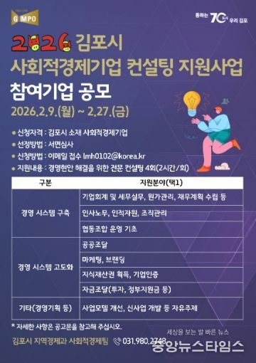 (중앙뉴스타임스 = 방재영 기자) 김포시가 관내 사회적경제기업의 지속 가능한 성장과 자생력 강화를 위해 ‘사회적경제기업 역량강화 컨설팅 지원사업’ 참여기업을 오는 2월 27일까지 모집한다.