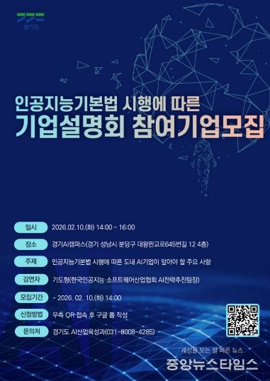 (중앙뉴스타임스 = 방재영 기자) 경기도가 지난 1월 22일 시행된 ‘인공지능 기본법’에 대한 도내 기업들의 이해를 돕기 위해 10일 오후 2시 판교 경기AI캠퍼스에서 AI 기업 대상 설명회를 개최한다.