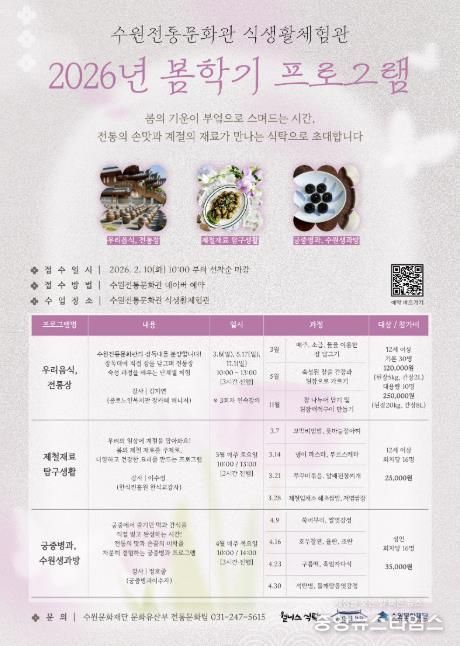 (중앙뉴스타임스 = 방재영 기자) 수원문화재단은 오는 10일부터 수원전통문화관 식생활체험관 2026년 봄학기 프로그램 참여자를 모집한다고 9일 밝혔다.