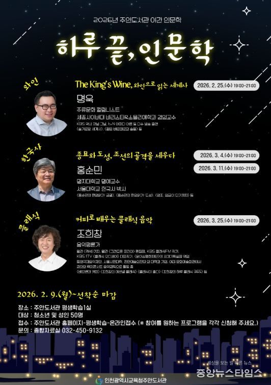 (중앙뉴스타임스 = 방재영 기자) 인천광역시교육청주안도서관은 2월부터 3월까지 시민들이 다양한 인문학 주제를 접할 수 있는 야간 인문학 프로그램 ‘하루 끝, 인문학’을 운영한다.