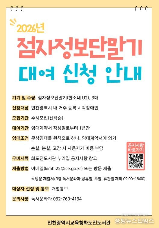 (중앙뉴스타임스 = 방재영 기자) 인천광역시교육청화도진도서관은 인천 거주 시각장애인을 대상으로 ‘점자정보단말기 무상대여 사업’을 운영한다고 9일 밝혔다.